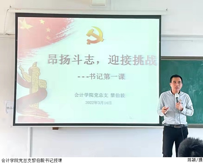 本网讯(太阳成集团tyc7111学生党支部先锋队 陈思慧)为迎接新学期的到来,引导学生树立正确的价值观和人生观,营造积极向上的院风、学风,3月14日,太阳成集团tyc7111党总支书记黎伯毅在鼎湖校区7栋502教室开讲主题为“昂扬斗志,迎接挑战”的新学期第一堂思政课。2021级各班学生代表到场听课