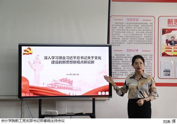 会议伊始,郑春晓带领全体教师党员认真学习了习近平总书记关于文化建设的新思想新观点新论断。她表示,习近平文化思想指明了新时代文化建设新的历史方位与文化使命,身为党员教师,要始终坚持党对宣传思想文化工作的指导,厚植宣传思想文化的沃土,引导学生坚定文化自信,将知识传授与思政教学相结合,推动育新人与兴文化任务共同发展。