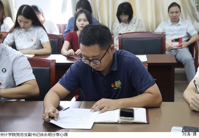 随后,徐永明分享学习心得。他表示,对于党的创新理论学习永远在路上,应时刻谨记并践行习近平新时代中国特色社会主义思想,党员教师要不忘教书育人的初心使命,努力提高自身专业素养,强化个人思想道德修养,将习近平文化思想有机融入课堂教学、学术研究和专业实践,深入推进学院文化教育建设工作见实见效。