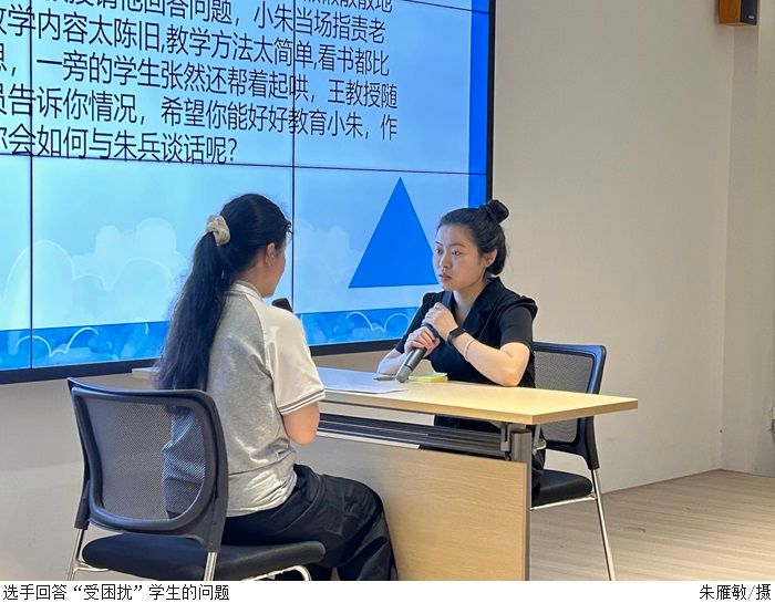 经过初赛的选拔,共有6名优秀辅导员进入到决赛。决赛以案例研讨、谈心谈话两个环节展开。在案例研讨环节中,选手两两分组,采用“我问你答”形式,共同剖析案例中的核心问题,探究解决之道、研究实验策略。比赛现场,选手们针对案例抽丝剥茧,层层深入,从价值引领、专业教育、沟通共情、经验总结等方面进行研讨思辨,展现出良好的现场应变和逻辑思辨能力。面对学生在学习、生活等个人成长成才过程中的各种困惑与问题,选手们镇定自如、春风化雨、循循善诱,用动之以情、晓之以理的方式与学生们进行谈心谈话,有效解开了学生们的心结。选手们的出色发挥,展现了辅导员平凡岗位上的不平凡,彰显立德树人的责任与担当。