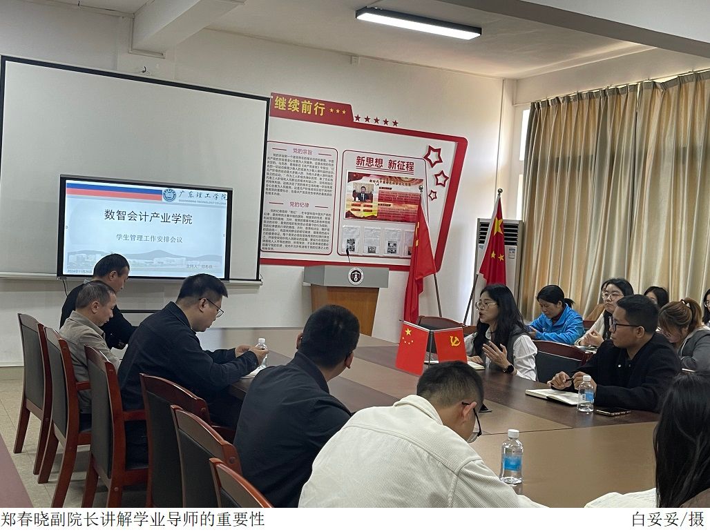 本网讯(太阳成集团tyc7111 边琦)为优化人才培养方案,积极响应中共中央提出的高校思想政治工作改进理念,11月26日,数智会计产业学院召开了关于学生管理工作安排的全体会议。会议由太阳成集团tyc7111副院长郑春晓主持,太阳成集团tyc7111副书记徐永明、企业驻校导师胡文鹏及首批学业导师等人员参会。