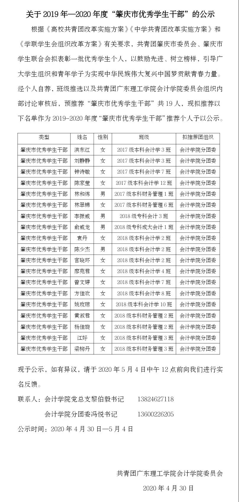 关于2019年—2020年度“肇庆市优秀学生干部”的公示