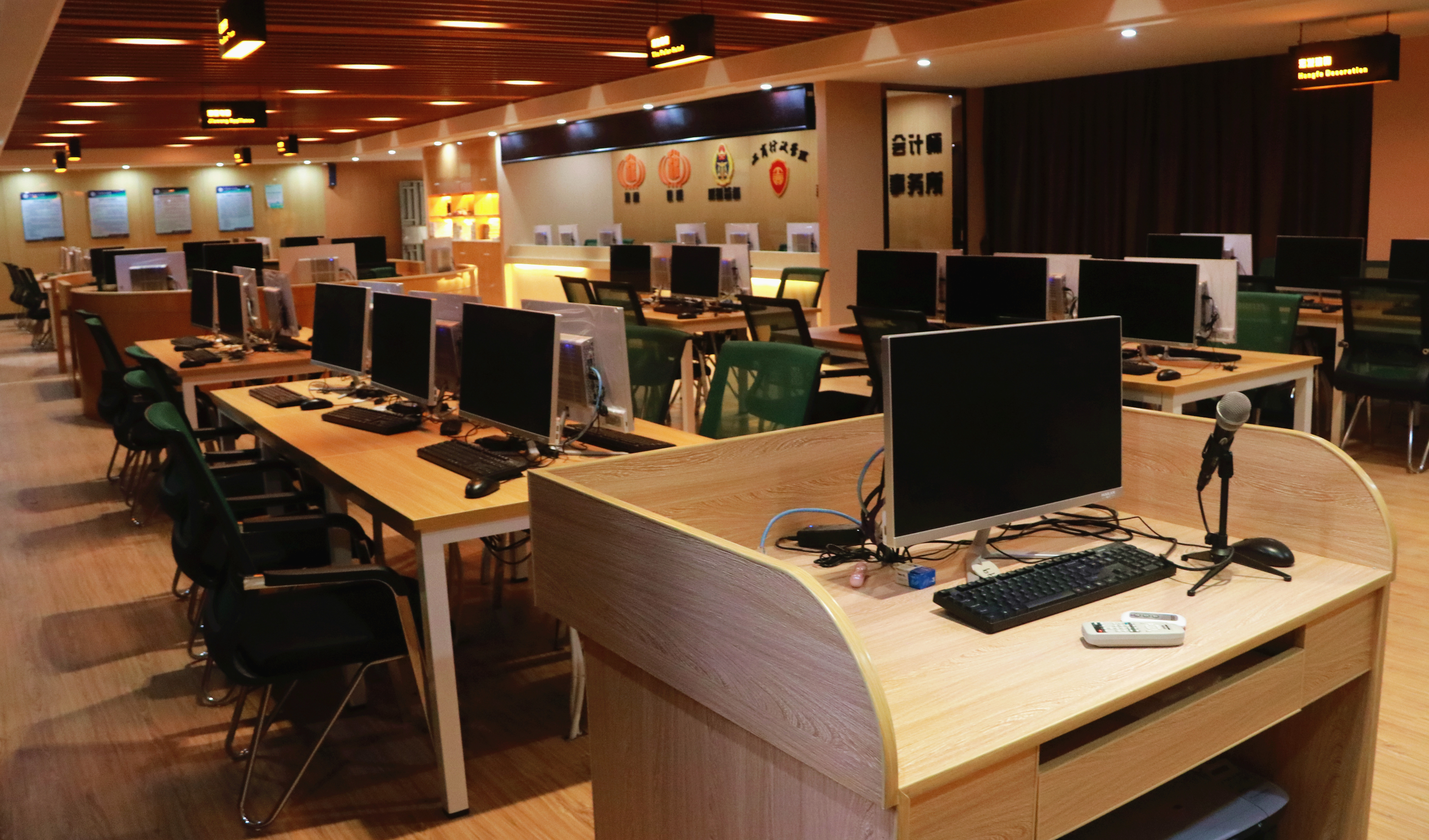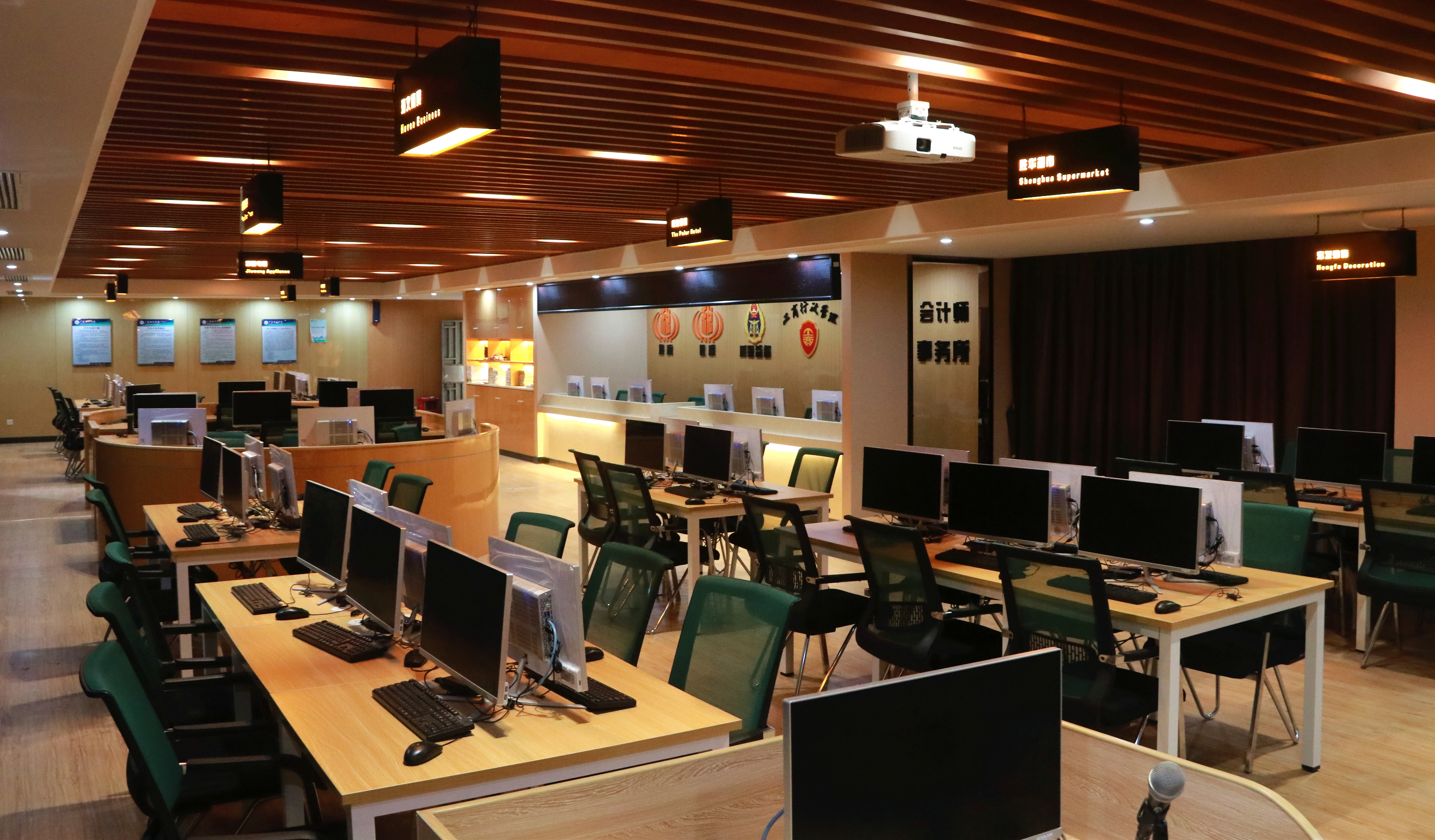 财会商圈综合实验室占地面积202.5平方米,计算机64台,主要面向会计系财务管理、会计学等专业学生。财会商圈是一款跨行业综合性仿真模拟实验室平台为依托,包括财务实验系统、企业管理(人力资源、采购、销售、仓管)实验系统、银行柜台交易系统、会计电算化实验系统、电子报税实验系统、综合服务、(国地税、工商、会计师事务所)系统、全真单据库系统、3D职业场景动画系统、多人对抗实验系统、综合教学管理系统、多媒体课件资源平台、智能评价判分系统和平台管理系统。实验室平台以仿真生产企业、商贸企业、物流企业、建筑企业、电商企业、服务业企业构建一个完整的以产业链为主线影射出现代商业社会中不同行业、不同规模企业中典型的业务模型,使学生能以多维的角度宏观了解整个产业链以及企业内部跨部门的间业务流转。同时,财会商圈也是一款跨专业的综合实验平台,将出纳实务、财务会计、会计电算化、税务会计、成本会计、财务管理、预算管理、审计、人力行政管理、进销存管理、生产管理、银行实务、外贸实务等经管类专业,通过不同的业务模型,将企业与外部服务机构如税务、银行、市场监督管理局、会计师事务所、公安局、住房公积金中心、人力资源和社会保障局等有机地联系起来,仿真生动的职业场景仿佛置于真实的企业环境中。学生通过在真实商业环境中得到的实践训练,有利于平稳而快速的进入职业成长通道,全面综合提高学生素质。