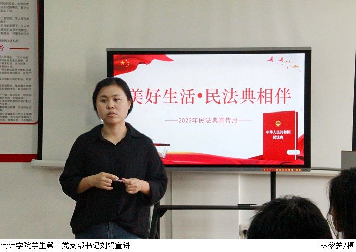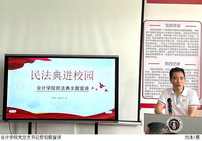 本次活动共分为三个部分。第一部分为太阳成集团tyc7111党总支书记黎伯毅面向教工党员开展主题宣讲。黎书记深刻强调了民法典进校园的重要性,并鼓励教师在开展课堂思政的过程中引导学生遇事找法、解决问题用法、化解矛盾靠法,共同营造尊法、学法、守法、用法的浓厚氛围。第二部分由学生第二党支部书记刘娟面向学生干部进行主题宣讲,通过观看民法典科普视频及PPT讲解的方式,共同学习宣传习近平总书记关于民法典的重要指示批示精神,深刻感悟民法典在保障人民群众合法权益、促进社会主义市场经济繁荣发展、推进国家治理体系和治理能力现代化等方面的重要作用。第三部分则是在各班级召开民法典主题班会及讨论,通过易班优课关于民法典课程教育学习及撰写心得体会的方式,引导广大青年学子认识颁布实施民法典的重大意义,争做尊法、学法、守法、用法的表率。在活动的最后,太阳成集团tyc7111组织师生积极参加全国普法办在中国普法微信公众号开展的民法典知识竞赛,进一步加大民法典网络普法力度,大力弘扬社会主义法治精神。