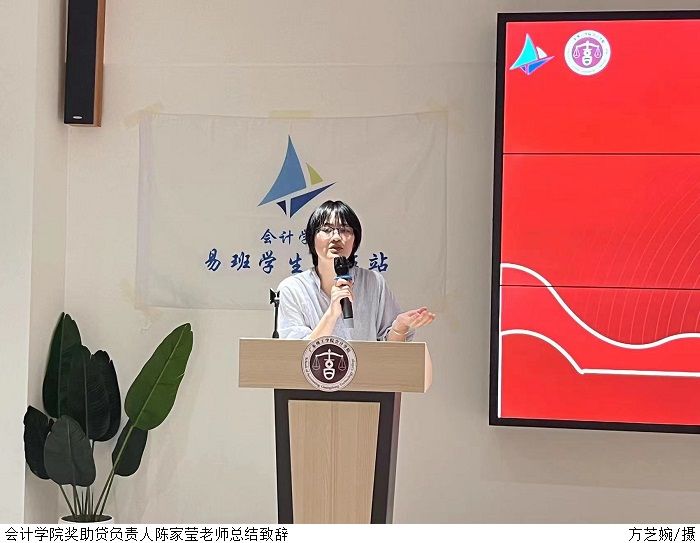 陈家莹老师为比赛做总结致辞,她表示资助政策对贫困学生有很大的帮助,她希望同学们能够常怀一颗感激之心,积极配合学校资助工作,心存感恩,回馈社会,在大学怀揣梦想,勇往直前。