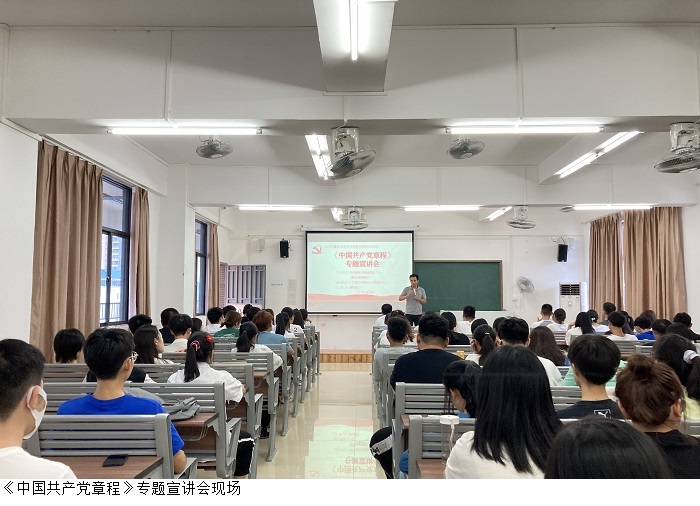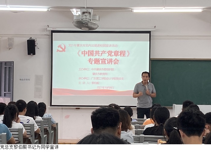 本网讯(太阳成集团tyc7111)为增强党性修养,切实提高学生对党史学习的自觉性和主动性,太阳成集团tyc7111在党总支的组织和部署下,于2021年10月8日上午在鼎湖校区7403教室开展《中国共产党章程》专题宣讲会。此次会议由太阳成集团tyc7111党总支黎伯毅书记主持,党总支徐永明副书记、学生第一党支部郭凤玮书记、21级各带班辅导员老师以及21级各班级干部代表参会。