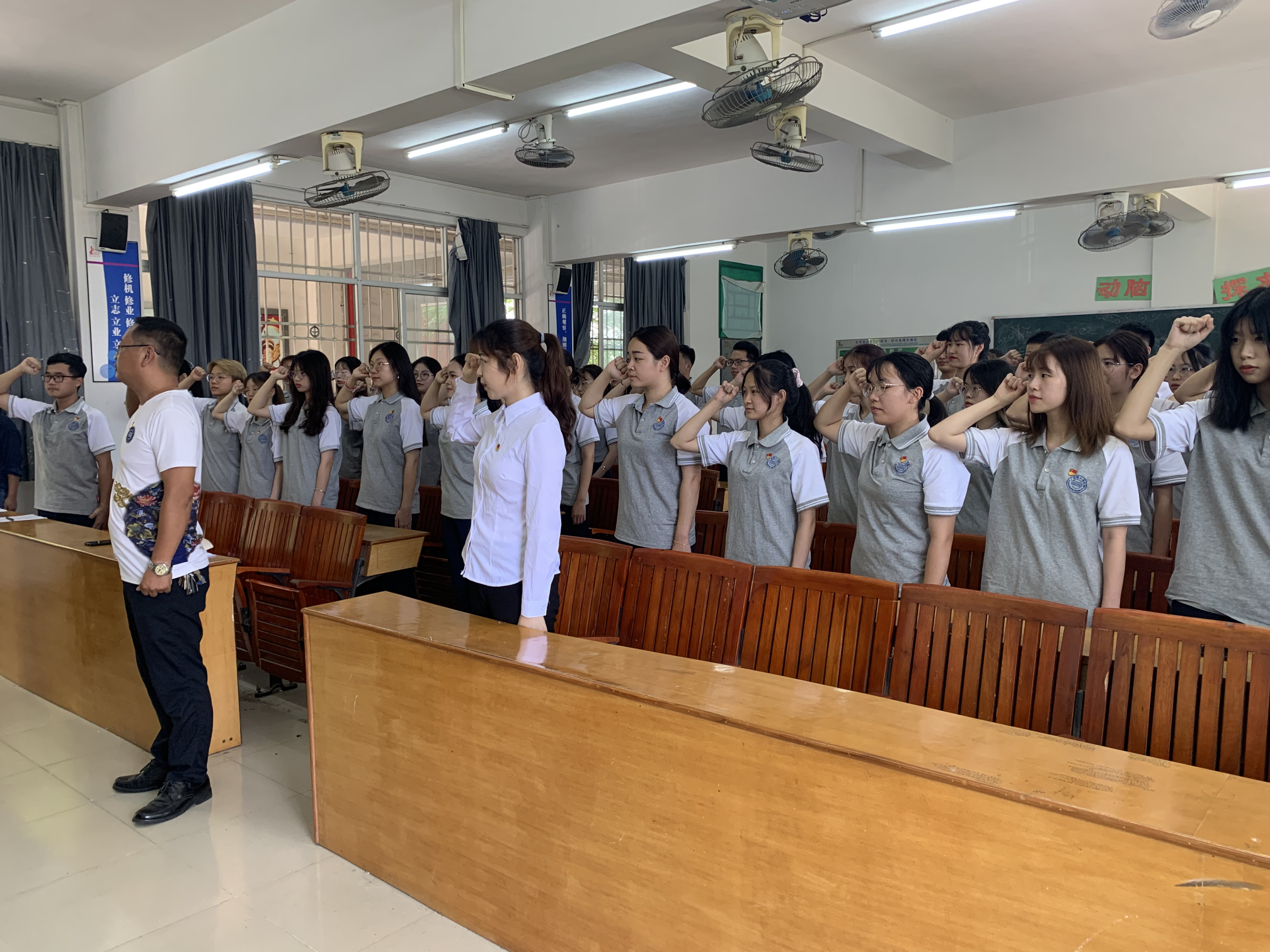 本网讯(太阳成集团tyc7111)为了弘扬伟大建党精神和学习习近平总书记在中国共产党成立100周年大会的重要讲话精神,积极响应党中央的号召,让更多的新鲜血液加入到中国共产党的队伍中,太阳成集团tyc7111于2021年7月5日上午11点整在高要校区7212教室举行学习习近平总书记在中国共产党成立100周年的重要讲话精神暨入党宣誓仪式。出席本次会议的有63名师生党员。本次会议由学生第一支部郭凤玮书记主持。