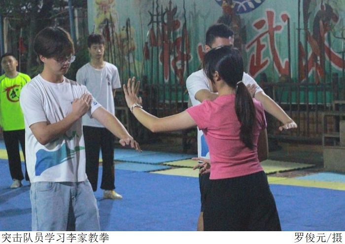 突击团队参观了存心武馆,见到了李家教拳传承人邱顕达,并在他的带领下深入了解了市级非遗武术项目李家教拳的传承培训基地。邱顕达为突击队讲解李家教拳的拳路和发力技巧等拳法套路后,由汕头市最年轻的市级非遗传承人邱奕仪带领突击队员亲身体验李家教拳。随后,突击队员们回到了老字号李家拳馆,与市级非遗李家教拳传人邱顕达聊起了李家教拳与汕头文化的渊源,更有幸访谈到了邱顕达教练的师傅。在访谈中,邱顕达对我方能为非遗李家教拳与非遗金平英歌所能提供的帮助进行详细了解和交流,并为来年的暑期“百千万工程”社会实践活动打下合作基础。