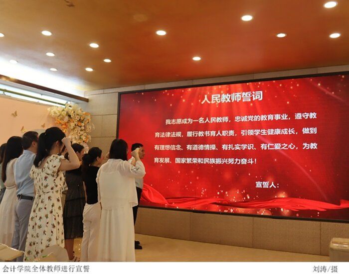 最后,全体教师进行宣誓,宣誓活动能增强教师的职业荣誉感和责任感,也明确教师的职业使命和责任,强化教师师德师风的建设。
