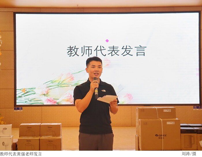 接着,教师代表黄强发言,他表示,很荣幸能够作为教师代表发言,感谢领导对辛勤付出的认可,也感谢学生的信任和学校的培养。最后祝愿全体老师教师节快乐。