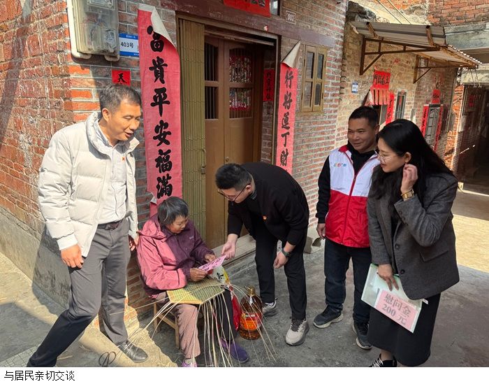 黎伯毅一行抵达夏岗社区后在社区党群服务中心与当地工作人员简短交流后,他们便携带精心准备的慰问品和慰问金,为当地居民提前送上新年的祝福,随后,慰问团队分组深入社区,走访了多户困难家庭。每到一处,他们都详细了解居民的生活状况和实际困难,耐心倾听他们的心声,并送上慰问品和慰问金,表达学院的关怀与支持。居民们纷纷表示感谢,脸上洋溢着温暖的笑容。