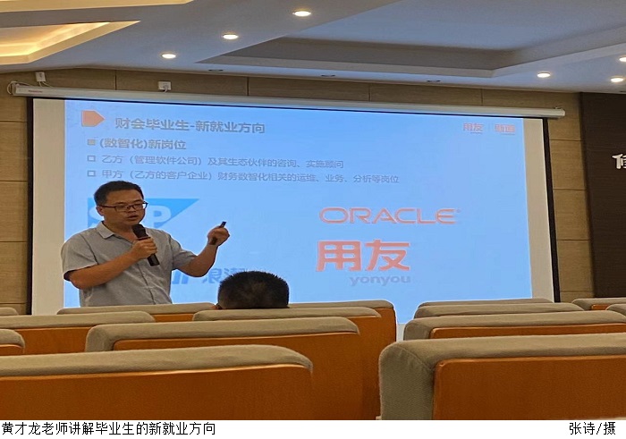 讲座开始,首先黄才龙老师先从专业角度,给大家介绍到本专业是培养符合区域经济和社会发展需要,具备创新精神、创业意识与合作能力的德智体美劳全面发展的秀质应用型人才。讲座中,黄才龙老师再从数智化的视角,用生动形象的实例带大家了解到,作为一名会计的路应该怎么走。一名好的会计不仅只是做账,在当今全面数智化的时代,会计更应该与时俱进。接着黄老师用一段视频回顾了从过去到现在“用友”实现了三个阶段的改变,大力发展校企协同政策,提高人才培养质量,打造数智化人才,为时代从高速高质发展向数智化方向前进。黄老师告诉大家会计人员要与人工智能优势互补,双双合作实现价值共享。讲座接近尾声时,黄老师现身说法,为大家解答了数智会计行业的就业情况以及该门课程的经费和未来薪酬等方面的疑惑。