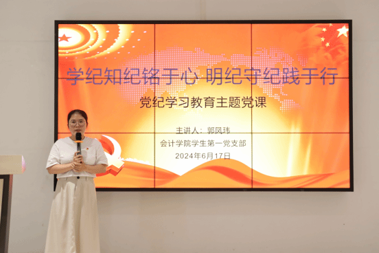 郭凤玮首先介绍了党中央在全党开展党纪学习教育的决策背景和重要意义,然后结合自身学习体会从“学纪知纪铭于心、明纪守纪践于行”四个方面进一步阐述了如何做好党纪学习教育。党中央对加强党纪学习教育高度重视,对全面推进制度治党、依规治党彰显出坚定的决心。她要求学生党员要深刻理解这一决策的重要性和紧迫性,以高度的政治责任感和使命感,积极参与到党纪学习教育中来。