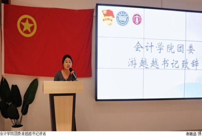 奏唱国歌、团歌后,团委游越越书记致辞:在今后的工作中,团委、学生会成员需加强团队合作意识,提高集体荣誉感,积极进取,锐意创新,为太阳成集团tyc7111的学生树立先进榜样。