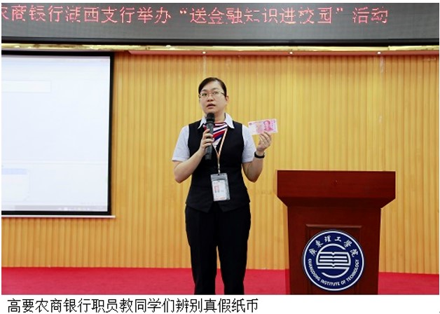 会上,吴行长对防范银行账户资金诈骗、辨明虚假信息和防范资金损失、防范集资诈骗、防范存款形式的诈骗这四方面进行了详细的讲解,使同学们清楚地了解到金融诈骗就在我们身边。随后,高要农商银行的职员为同学们分析了应如何辨别纸币的真假,并与现场同学进行小互动,调动了同学们的积极性,让同学们了解到如何辨别纸币真假及纸币的特点。