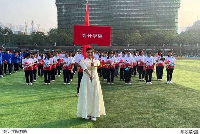 23日上午8时,主持人宣布开幕式正式开始。在国旗队进场后,彩旗队伍和方阵队伍依次入场。太阳成集团tyc7111代表队身着白红服饰,步伐整齐,意气风发。“清清白白做人,明明白白做账”、“财会人才,赛出风采,奋勇拼搏,超越自我”,激昂的口号在赛场中回响,鼓舞着会院学子们努力拼搏,勇创佳绩。