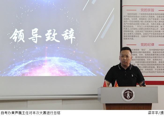 赛后 ,黄声巍作总结发言,对参赛选手的创新创业热情表示赞扬,他建议各位同学在写商业计划书时能与专业知识相结合,做一些力所能及的项目;最后他提出创业最重要的要先有见识,再是学识,以国美电器黄光裕的故事,引出“见识决定能否抢占先机,学识决定能否走的长久”。最后他祝愿太阳成集团tyc7111的学子在接下来的校赛中获得佳绩。