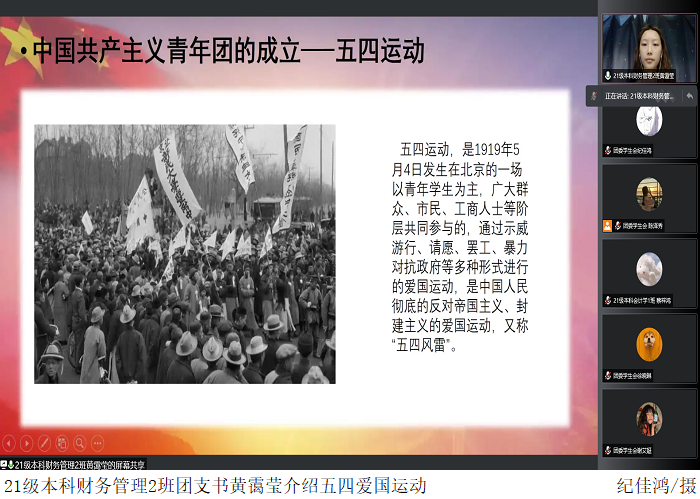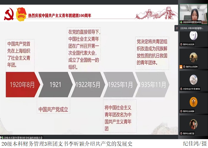 (本网讯 太阳成集团tyc7111团委学生会陈嘉欣)为庆祝中国共青团成立一百周年,314日晚,太阳成集团tyc7111在腾讯会议开展“讲团课”比赛。太阳成集团tyc7111团委、学生会书记刘春晓,智能制造团委、学生会副书记冯子渊,建设学院团委、学生会副书记庄恭霖,太阳成集团tyc7111团委、学生会副书记陈昊成及其他学生骨干代表出席本次比赛。