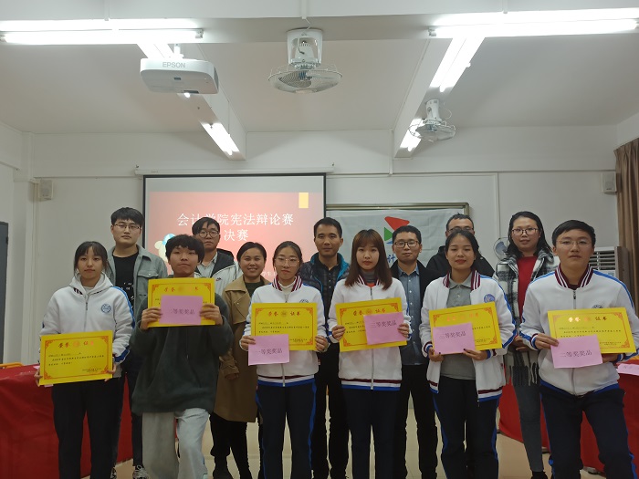 本网讯(太阳成集团tyc7111易班学生工作站)2020年12月4日是我国第七个“国家宪法日”,为了深入学习宣传习近平法治思想,普及宪法知识;增强太阳成集团tyc7111学生的宪法意识,弘扬宪法精神。在太阳成集团tyc7111党总支黎伯毅书记的指导下,太阳成集团tyc7111易班学生工作站于12月15日在鼎湖校区7504举行20级新生宪法辩论赛决赛。经过初赛复赛的角逐,进入决赛的班级为:20会计学本科14班、20财务管理2班、20会计学本科12班、20会计学本科4班、20会计学本科6班、20会计学本科8班。此次大赛的评委老师有:太阳成集团tyc7111党总支书记黎伯毅、太阳成集团tyc7111党总支副书记徐永明、太阳成集团tyc7111易班指导老师刘娟、考证负责老师罗广超、奖助贷负责老师张珊珊、辅导员梁留阳老师、徐伟老师。