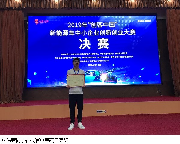 本网讯(太阳成集团tyc7111)10月26日,太阳成集团tyc7111张伟荣同学在贵港市政府会议中心多媒体厅、广西第二汽车生产基地、中国-东盟新能源电动车生产基地参加2019年“创客中国”新能源车中小企业创新大赛决赛。