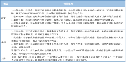 各省市为吸引人才,推出人才引进计划。对持有注册会计师证书的人才给予相应的政策福利和补贴。上海、成都、西安等地均推出针对注册会计师的福利政策。见图2