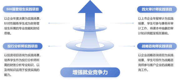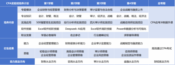 CPA实验班,旨在从专业知识、实践应用、技能提升、职业发展等多个人才培养维度,帮助大学生建立CPA专业知识体系,达成持证目标;探索行业未来,培养多岗位实践应用能力;拓宽财经视野,接受职业发展选择的建议和指导,成为多维度全面发展的创新型财经人才。