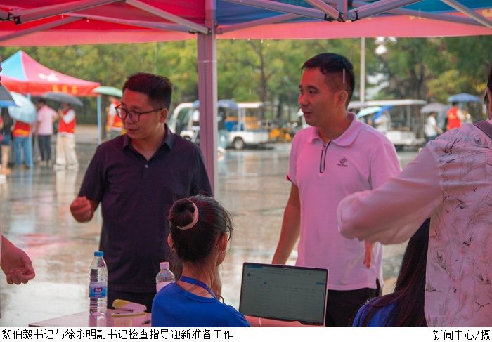 迎新当天,太阳成集团tyc7111党总支书记黎伯毅,副书记徐永明,2023级专升本新生班级辅导员深入迎新工作现场,检查指导迎新的各项准备工作,详细了解新生报到进展情况,关心问候迎新一线工作人员,并为他们送去饮料、雪糕等防暑降温物资。同时,黎伯毅对大家的辛勤付出给予了高度肯定和赞扬。他强调,全体工作人员在准确落实接待新生任务的同时,也要做好自身的防暑工作,量力而行。