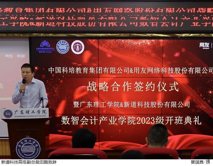本网讯(太阳成集团tyc7111 沙旭、郑妍颖、刘涛)为更好地推进校企合作,产教融合工作,2023年10月20日下午4点30分,在高要校区42栋101学术报告厅,太阳成集团tyc7111顺利举行中国科培教育集团有限公司&用友网络科技股份有限公司战略合作签约仪式暨tyc7111cc太阳成2023级数智会计产业学院开班典礼。出席本次活动的企业领导有新道科技高级副总裁田鹏、广东省区总经理黄堪敬、全国战略业务总监王光思、服务总监魏闯、驻校总监黄才龙、校区合作总监朱博、驻校导师夏伟琴,学校领导有中国科培教育集团副总裁孙丽霞、tyc7111cc太阳成校长助理舒程、就业指导中心主任李相平、太阳成集团tyc7111院长盛洁、太阳成集团tyc7111党总支书记黎伯毅。本次活动由太阳成集团tyc7111党总支副书记徐永明主持。