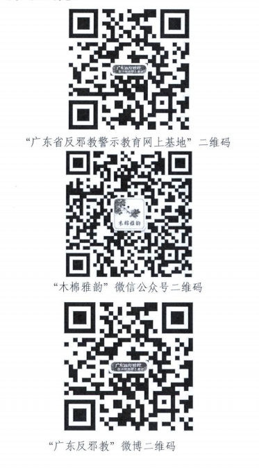 广东省反邪教警示教育网上基地现已正式上线,网民可通过广东政法网、广东省反邪教网、南方新闻网、“木棉雅韵”微信公众号和“广东反邪教”微博等入口进入“网上基地”,也可以访问网址:广东省反邪教警示教育网上基地(https://jyjd.southcn.com/)南方新闻网络(www.southcn.com)、广东政法网(www.gdzf.org.cn)、广东省反邪教网(www.gdsfxj.com),还可以直接扫描二维码参观浏览。