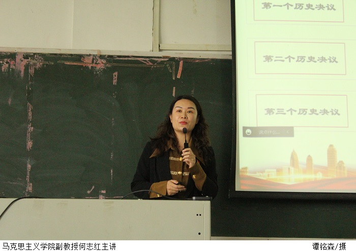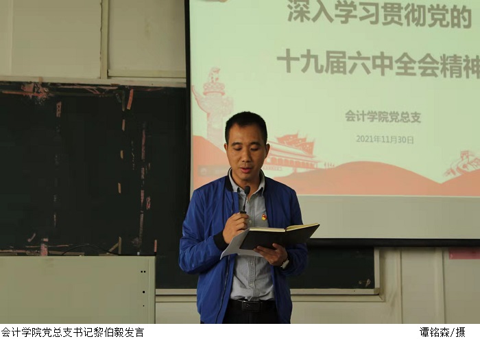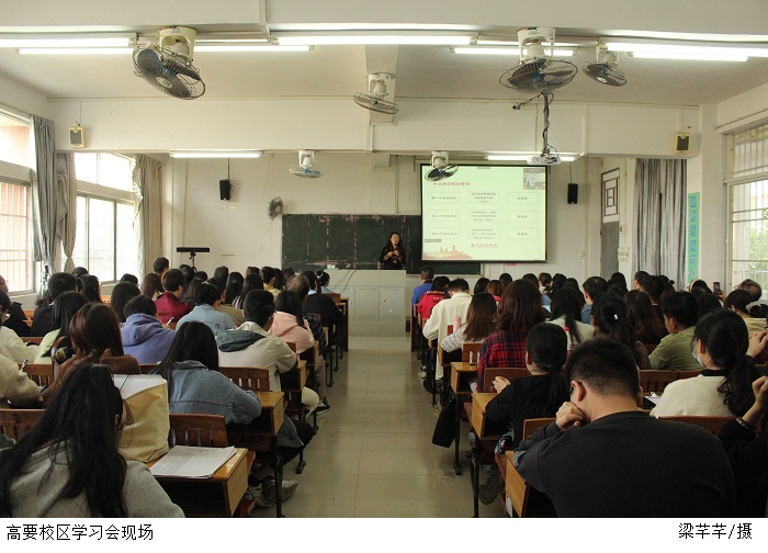 本网讯(太阳成集团tyc7111新闻中心 詹思妍)11月30日下午,太阳成集团tyc7111党总支在高要校区7312课室召开学习贯彻党的十九届六中全会精神宣讲会,同时在鼎湖校区6110课室同步直播。此次宣讲会由太阳成集团tyc7111党总支书记黎伯毅主持,马克思主义学院副教授何志红主讲,太阳成集团tyc7111全体教职工及学生代表参会。