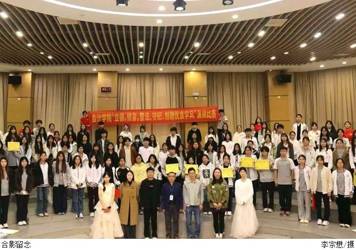 比赛伊始,由徐永明副书记作开场致辞。他以“立德石”为切入点,强调了太阳成集团tyc7111全体教师以“立德树人”为价值导向的优良传统,希望各位同学们能够以各位老师们为榜样,将“立德修身”融入日常学习生活,将“创建优良学风”落到实处,并预祝各位选手在比赛中取得优异成绩。紧接着,参赛选手依次登台进行演讲,选手们紧扣“立德、修身、普法、守纪”的演讲主题,通过案例分析与法条阐释,深刻论述了法治精神对大学生成长成才的重要意义。随后,彭清林书记对选手们的精彩表现给予充分肯定。他强调,学子们应坚守会计职业道德,秉持诚信、专业、公正、责任的核心价值观,为增强个人专业素质奠定坚实基础。随后,经过选手们的激烈角逐和评委老师的公正评判,本次演讲比赛金奖获得者:陈恩谊;银奖获得者:陈柳如;铜奖获得者:王然。活动最后,评委、选手及观众们一同合影留念。
