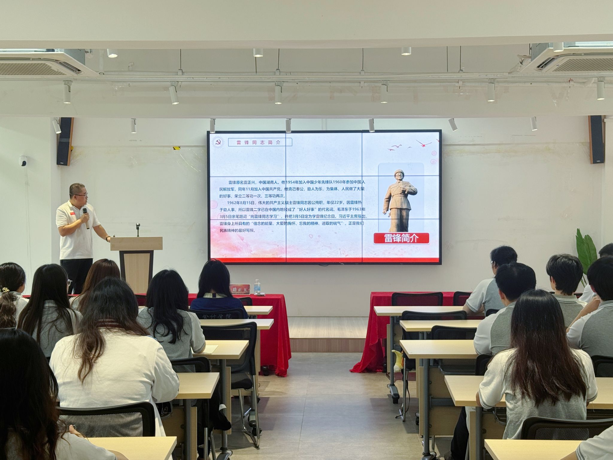 第一课初始,全体青马学员起立并奏唱国歌、团歌。随后,副书记路正玉围绕雷锋精神传承授课。他强调,青马学员要坚定理想信念、传承红色基因,自觉践行雷锋无私奉献、爱岗敬业、助人为乐的优良品质,坚决摒弃“躺平”心态,立足青年身份勤学实干、主动担当。他鼓励大家积极参与学校、学院组织的各类志愿服务活动,以实际行动践行雷锋精神、发挥先锋模范作用,让青春力量融入党和国家事业发展大局,引导学员深刻理解理论内涵、明晰责任使命。本次授课既有理论高度,又贴近青年实际,现场学习氛围浓厚。