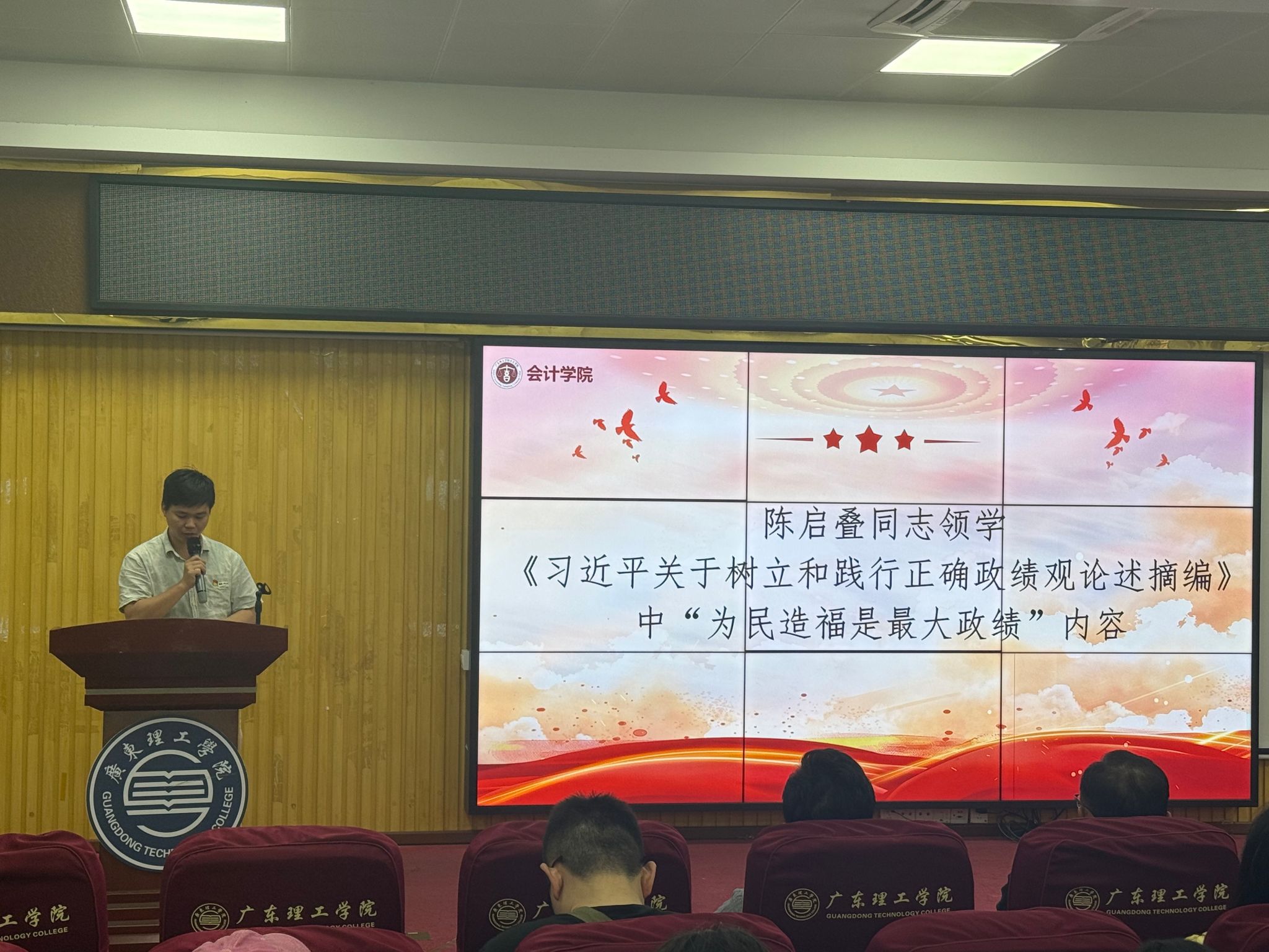 会上,陈启叠老师带领全体教职工深入学习《习近平关于树立和践行正确政绩观论述摘编》中“为民造福是最大政绩”重要篇章,并结合自身教学育人工作实践分享学习心得。他表示,习近平总书记强调:“什么是好事实事,要从群众切身需要来考量,不能主观臆断,不能简单化、片面化。”而教育工作者的最大政绩,就是培养好每一位学生,把学生的成长成才放在心中最高位置。他谈到,在日常教学和管理工作中,要始终坚持“以学生为中心”,摒弃短期化、表面化的“面子工程”,脚踏实地做好课程建设、学风引导、实践指导等基础性工作,真正把“为民造福”的要求落实到教书育人全过程。