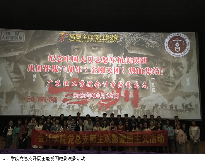 本网讯(太阳成集团tyc7111新闻中心 何嘉敏)为了纪念中国人民志愿军抗美援朝出国作战70周年,告慰197653位抗美援朝烈士。于2020年10月23日晚上7点整,太阳成集团tyc7111党总支在高要金逸珠江影城开展以“金刚天团!热血集结!”主题的爱国电影观影活动,参加本次活动的有党总支黎伯毅书记、党员教师们以及学生们。