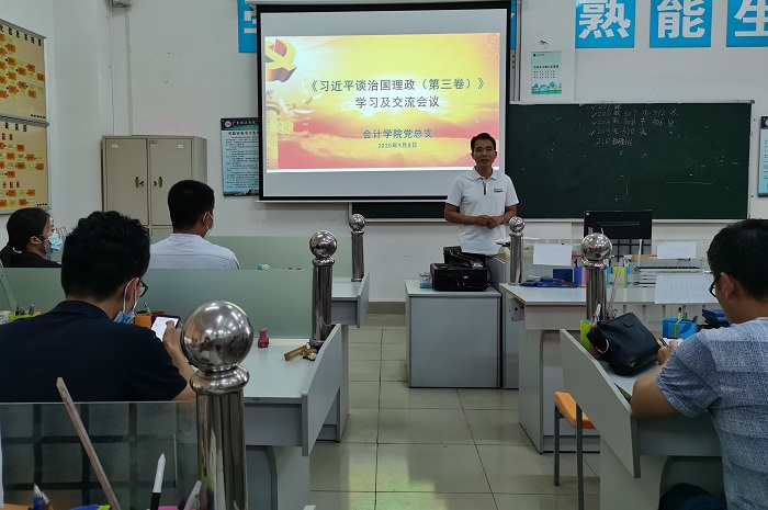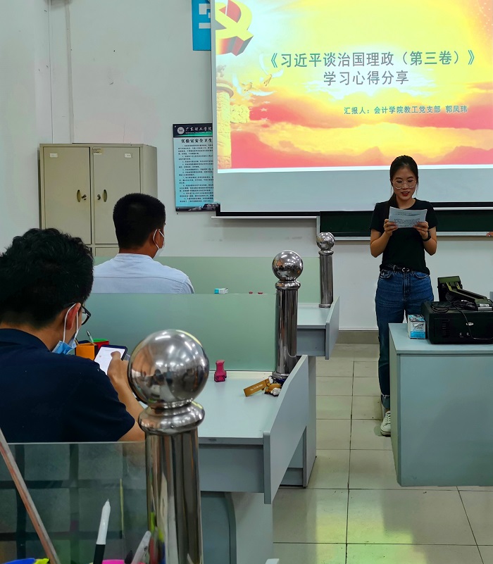 教工党员岑逸翘老师和郭凤玮老师依次分享了学习《习近平谈治国理政(第三卷)》的心得。岑逸翘老师着重从课程思政的角度,阐述高校教师如何在专业育人的过程中融入思政元素,不断提升教书育人的水平。郭凤玮老师主要从学生的视角,分析了学生眼中所见证的小康社会的图景,认为应当关注学生需求,引领他们参与社会实践。