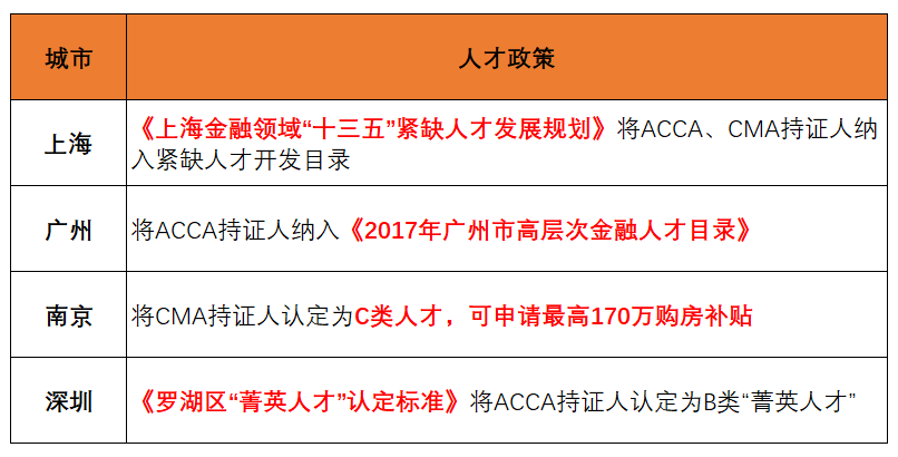 实验班选用ACCA、CMA证书知识体系,ACCA、CMA持证人作为高端财务金融领域人才,受到各地政府的重视,被上海、广州、南京等一二线城市纳入高端人才引进计划,给予政策扶持与补贴。