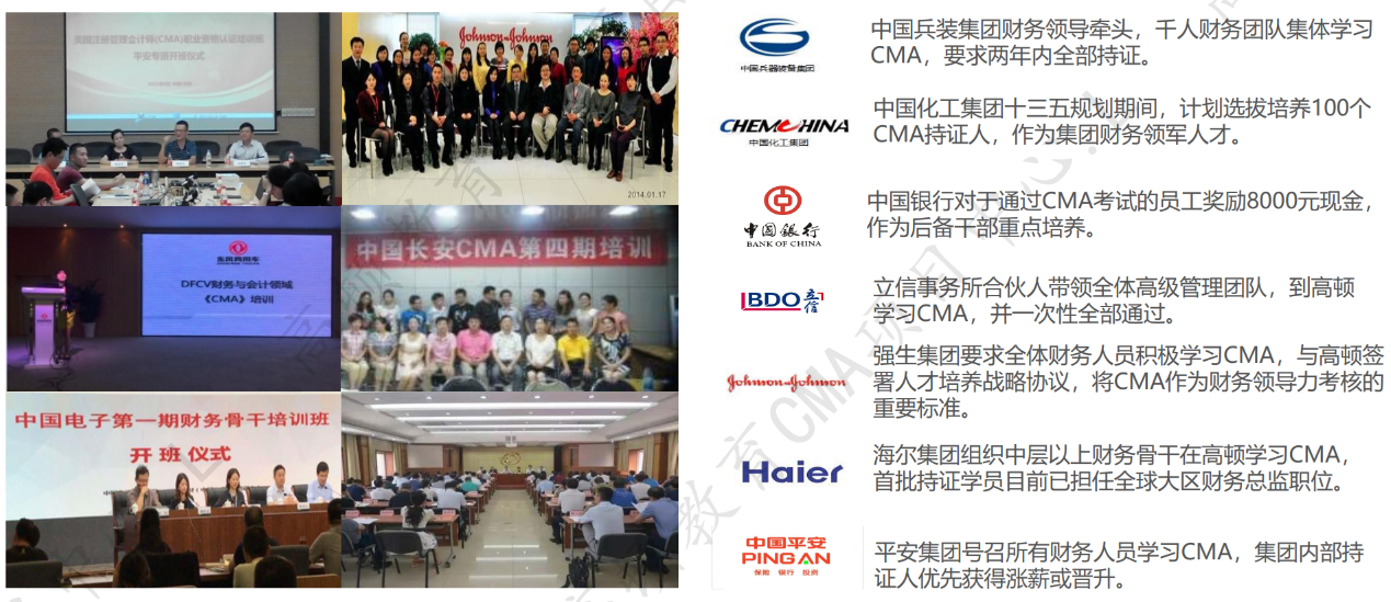 CMA在全球180多个国家和地区拥有认可雇主企业覆盖事务所、金融服务、科技等众多500强企业,这些企业在同等条件下会优先录取CMA学员。中国银行、中国平安、强生等企业纷纷展开CMA企业内训,培养企业管理会计人才。